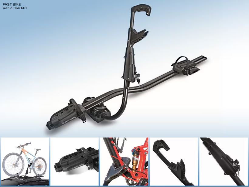 Kompletne zmontovaný a pripravený na použitie. Možnosť montáže na obe strany strechy vozidla. Upevňuje sa na priečniky bez použitia náradia a je vybavený dvojitým systémom uzamykania proti krádeži. Dodatočnou ochranou rámu bicykla je vnútorný povrch „svoriek“ pokrytý gumovou vrstvou. Ergonomická rukoväť je umiestnená v spodnej časti nosiča, aby sa uľahčilo upevňovanie bicykla. Dodáva sa so skrutkami tvaru (T) pre hliníkové tyče. Pre montáž na oceľové tyče či bez vodičov je potrebná upevňovacia súprava ref. č. 160 850.