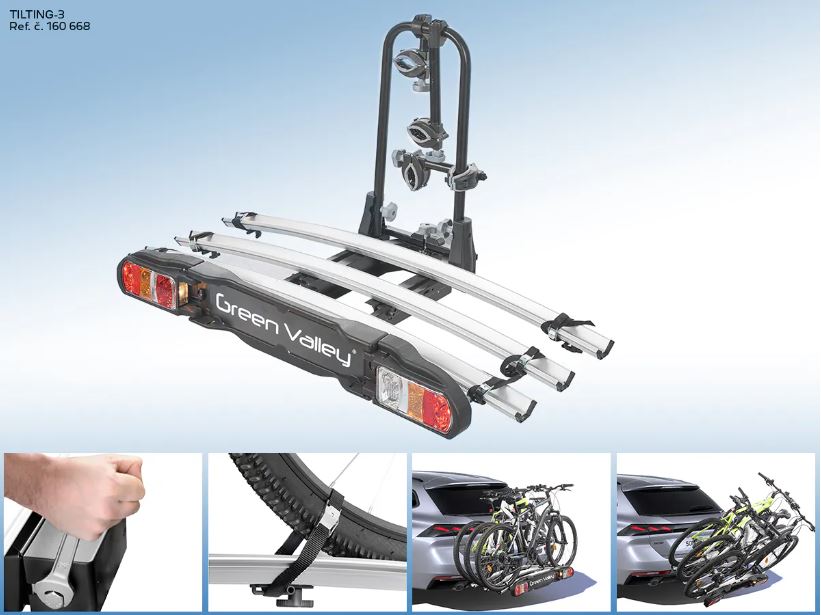 Nosič je skladateľný, vyrobený z vysokopevnostnej ocele a spĺňa najvyššie bezpečnostné normy. Naklápací systém umožňuje otváranie kufra aj s bicyklami a nosičom namontovaným na ťažnom zariadení. Vyklápanie aj na dlhých zadných dverách dodávok. Systém proti krádeži na ťažnom zariadení. Osvetlenie prepojíte prostredníctvom 13-pinového konektora. Vhodný pre širokú škálu bicyklov vrátane elektrobicyklov. Nosnosť až 2 elektrobicykle.