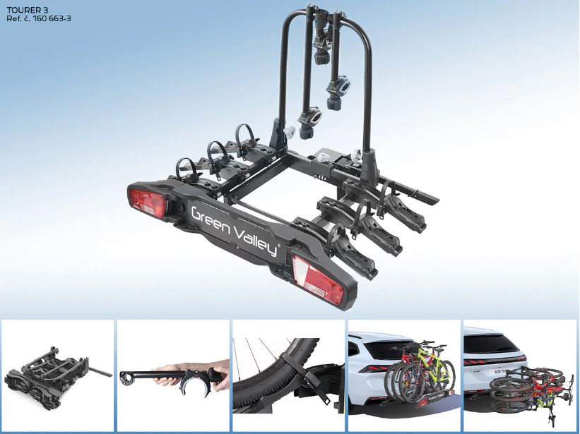 Oceľový rám a hliníkové koľajnice prispievajú ku kompaktnosti a ľahkosti nosiča. Sklopný systém pre jednoduchý prístup do batožinového priestoru. Osvetlenie prepojíte prostredníctvom 13-pinového konektora. Nosnosť až 2 elektrobicykle.