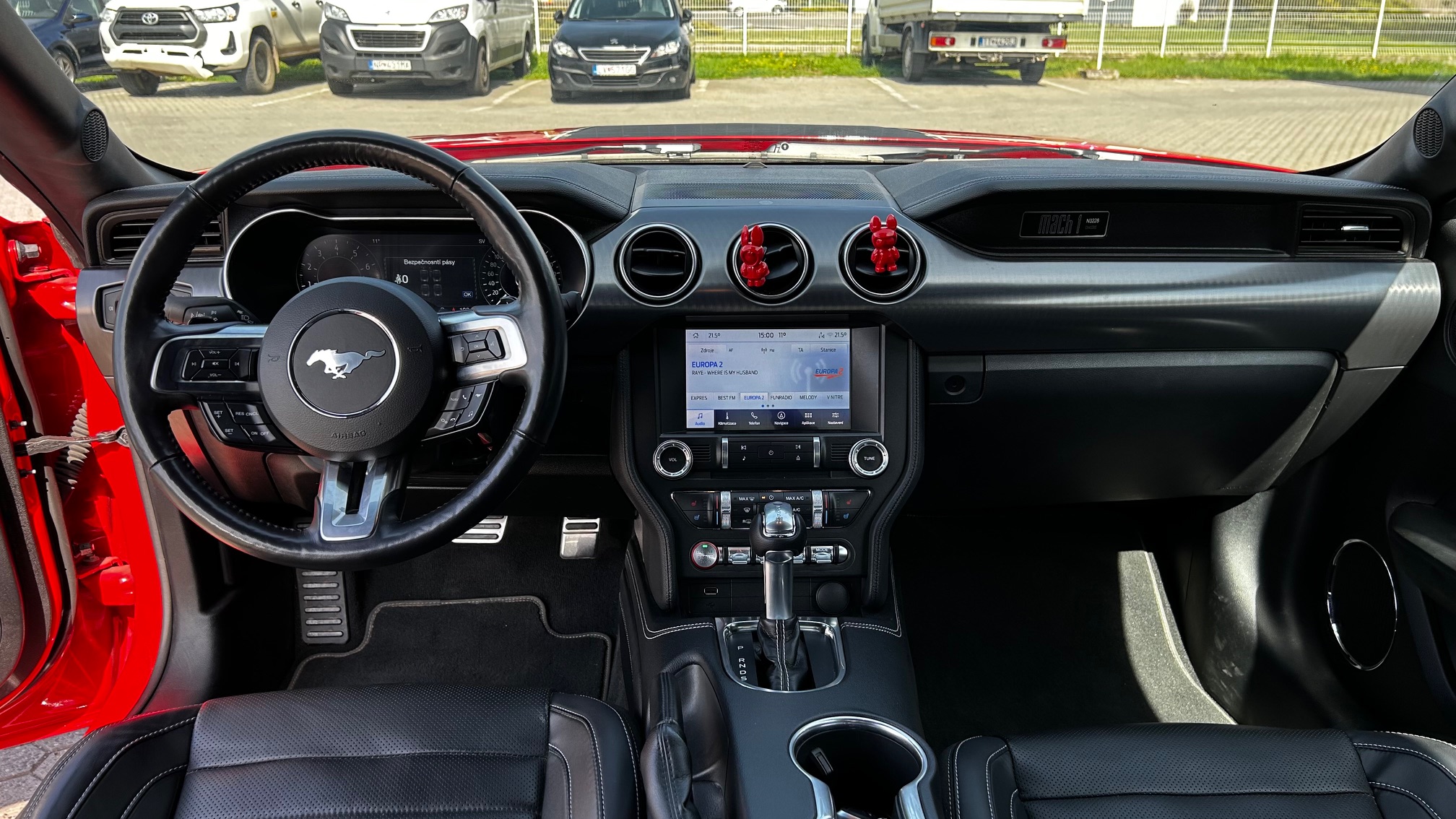 Aktívna dvojstupňová regulácia výfuku elektronicky riadené klapky výfuku s reguláciou hlasitosti zvuku + tichý režim, EPAS - elektrický posilňovač riadenia s variabilným účinkom + nastaviteľné režimy posilňovača, Elektricky ovládané predné okná s impulznou funkciou, Elektricky vyhrievané a ventilované predné sedadlá s nastaviteľnou intenzitou, Exteriérová sada MACH 1 naviac oproti verzii GT - trojfarebný polep kapoty (3 varianty podľa zvoleného laku karosérie) - športové pruhy v spodnej časti vozidla (3 varianty podľa zvoleného laku karosérie) - unikátna horná a spodná mriežka chladiča - znak MACH 1 na predných blatníkoch - tvarovanie predného nárazníka včetne odbočovacích svetiel (zo Shelby GT350) - tvarovanie zadného difúzora (zo Shelby GT500) - zadný spojler v matnom vyhotovení, Hliníkové športové pedále, Kožené čalúnenie sedadiel SALERNO MACH 1 v čiernom vyhotovení so šedým kontrastným pruhom - vyhrievané a ventilované predné sedadlá, LDW + LKA LDW - varovanie pred nemyselným opustením jazdného pruhu LKA - systém pre automatické navracanie do jazdného pruhu, MACH 1 Performance sada naviac oproti verzii GT - TREMEC® manuálna prevodovka testovaná pre odolnosť na okruhových závodoch a posilnenie systému olejového chladenia ( zo Shelby GT350 ) - vylepšený prenos točivého momentu automatickej prevodovky optimalizovaný pre vysoký výkon (kalibrované pre športové radenie) včetne posilneného systému olejového chladenia - posilnené chladenie zadnej nápravy ( zo Shelby GT500 ) - predný a zadný rám nápravy ( zo Shelby GT 350 ) a zadná spojovacia tyč ( zo Shelby GT 500 ) pre presné radenie - zväčšenie, Ozdobné kryty prahov predných dverí, Predné Full LED svetlomety LED DRL predné svetlá funkciou denného svietenia + auto-funkcia zapnutia svetlometov + dažďový senzor + monochromatické vnútorné spätné zrkadlo, Zadný nárazník s difúzorom, Športové brzdy GT Performance so 6-piestikovými strmeňmi Brembo 15' (380mm) brzdovými kotúčmi na prednej náprave, Športové odpruženie