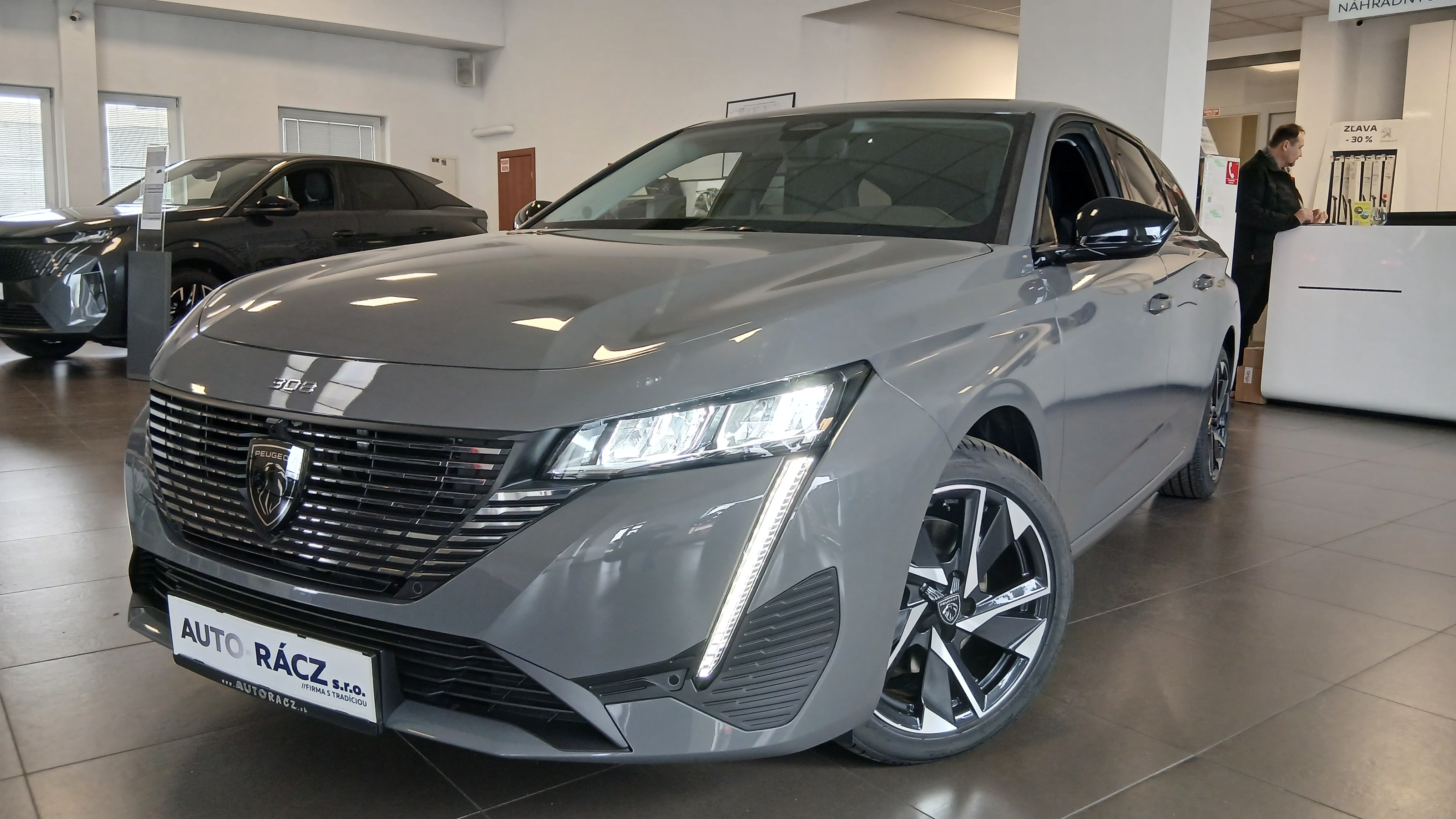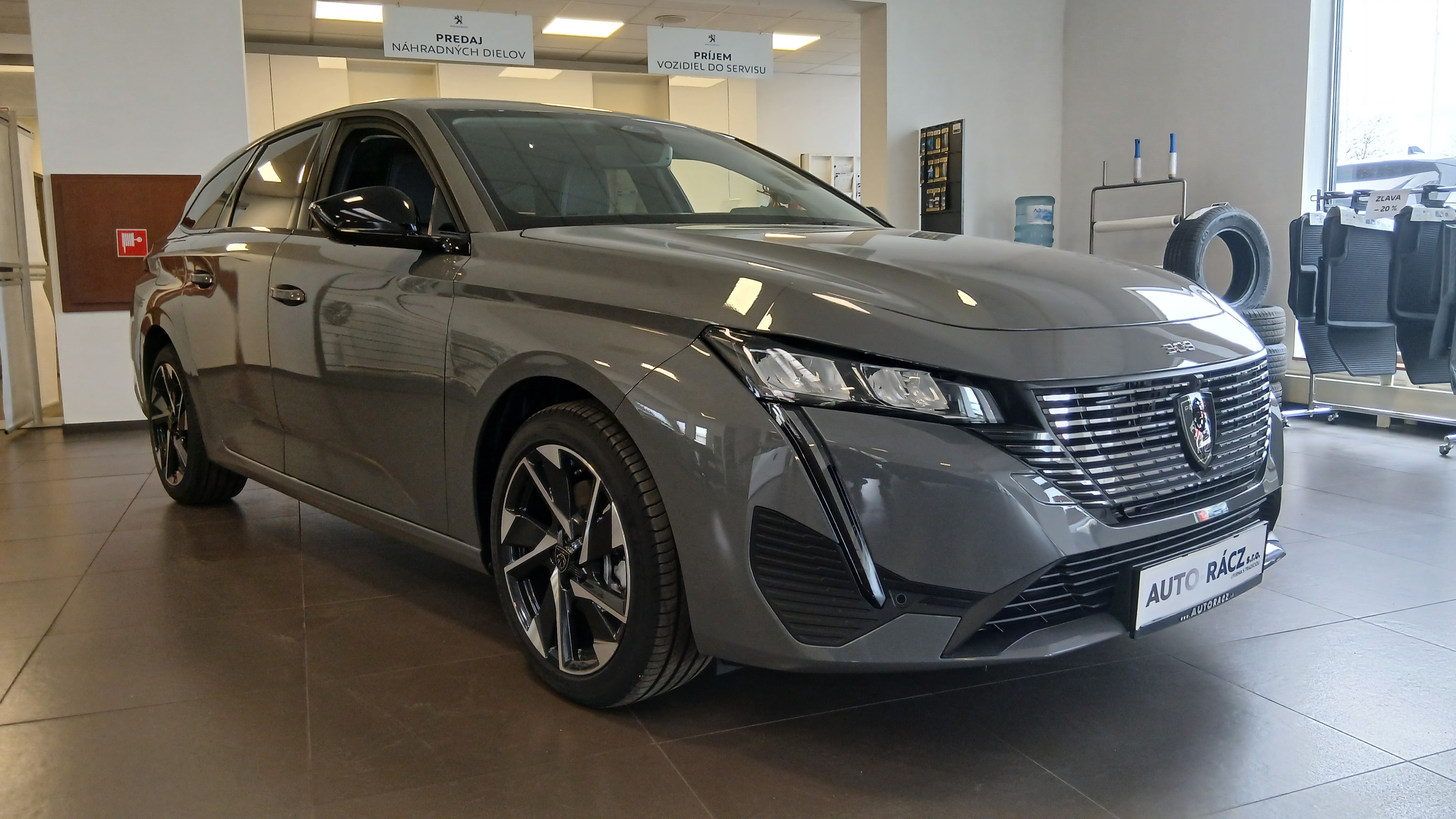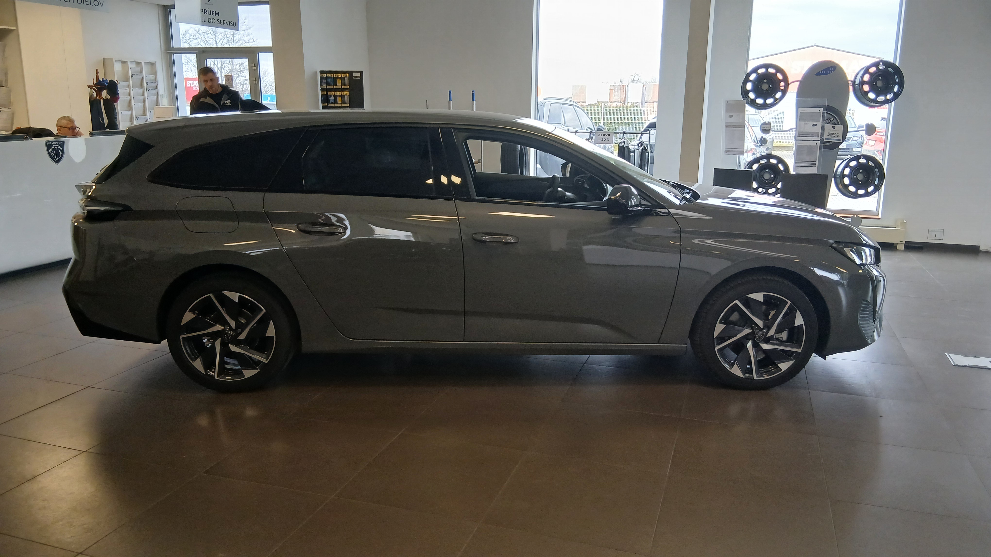 • Výbava: Pohon a technické parametre: Naftový motor s objemom 1499 ccm a výkonom 96 kW (130 k), kombinovaný s 8-stupňovou automatickou prevodovkou (EAT8). Vozidlo je vybavené elektrickou parkovacou brzdou. Bezpečnosť a asistenti: Pack Safety: Zahŕňa automatické núdzové brzdenie (Active Safety Brake), varovanie pred neúmyselným opustením jazdného pruhu a systém sledovania únavy vodiča (Driver Attention system). Zadné parkovacie senzory spolu so zadnou parkovacou kamerou. Tempomat a obmedzovač rýchlosti. Systém rozpoznávania dopravných značiek a úchyty Isofix na zadných sedadlách. Predné, bočné a hlavové airbagy. Svetlá a viditeľnosť: Predné a zadné LED svetlá s automatickým prepínaním diaľkových svetlometov. ◦Pack Visibilité: Obsahuje automatické rozsvietenie svetiel, dažďový senzor a elektrochromatické vnútorné spätné zrkadlo. •Interiér a komfort: Peugeot i-Cockpit: Vyvýšený digitálny 10" prístrojový panel a 10" dotykový farebný displej. Automatická dvojzónová klimatizácia a bezkľúčový systém štartovania. Ergonomické predné sedadlá s tmavým kombinovaným čalúnením FALGO (látka + syntetická koža). Multifunkčný kožený športový volant, ktorý je výškovo a osovo nastaviteľný. Pack Confort: Výklopná opierka rúk vzadu s otvorom na lyže. Konektivita: Rádio s digitálnym DAB tunerom, Bluetooth, 2x USB C a bezdrôtová funkcia Mirror Screen (Apple CarPlay a Android Auto). Exteriér: 17" zliatinové disky CALGARY. Extratónované zadné okná a čierne lesklé lišty bočných okien. Elektricky nastaviteľné, vyhrievané a elektricky sklápateľné spätné zrkadlá. Voliteľná (doplnková) výbava V tejto konkrétnej ponuke sú nad rámec základnej výbavy zvolené tieto položky: Farba: Metalíza Sivá SELENIUM (kód LDM0). Pack Comfort: Rozšírený balík komfortných prvkov (kód J6C8). Pack Vision & Drive Assist + Alarm: Kombinácia pokročilých asistenčných systémov, videnia a zabezpečenia vozidla (kód J6GT). Odnímateľné ťažné zariadenie: (kód AQ05). Deliaca sieťka v batožinovom priestore: (kód NM02). Sada na opravu defektu: (kód LV02)